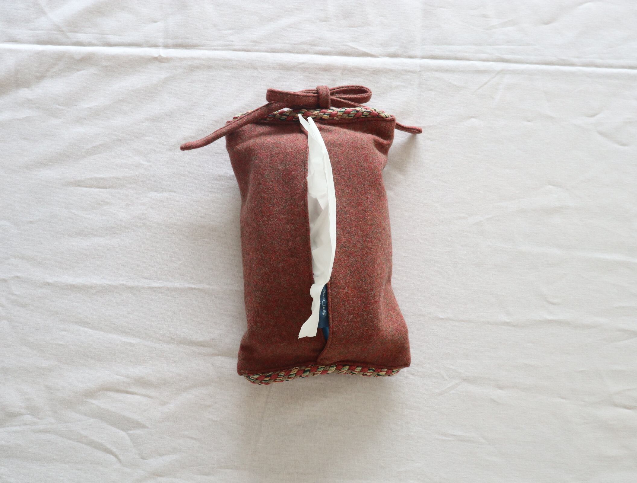 落ち着いたグレイッシュピンクのウール混生地に、アメリカ輸入パイピングで縁取った、当店オリジナルのソフトティッシュ対応のティッシュカバーです。