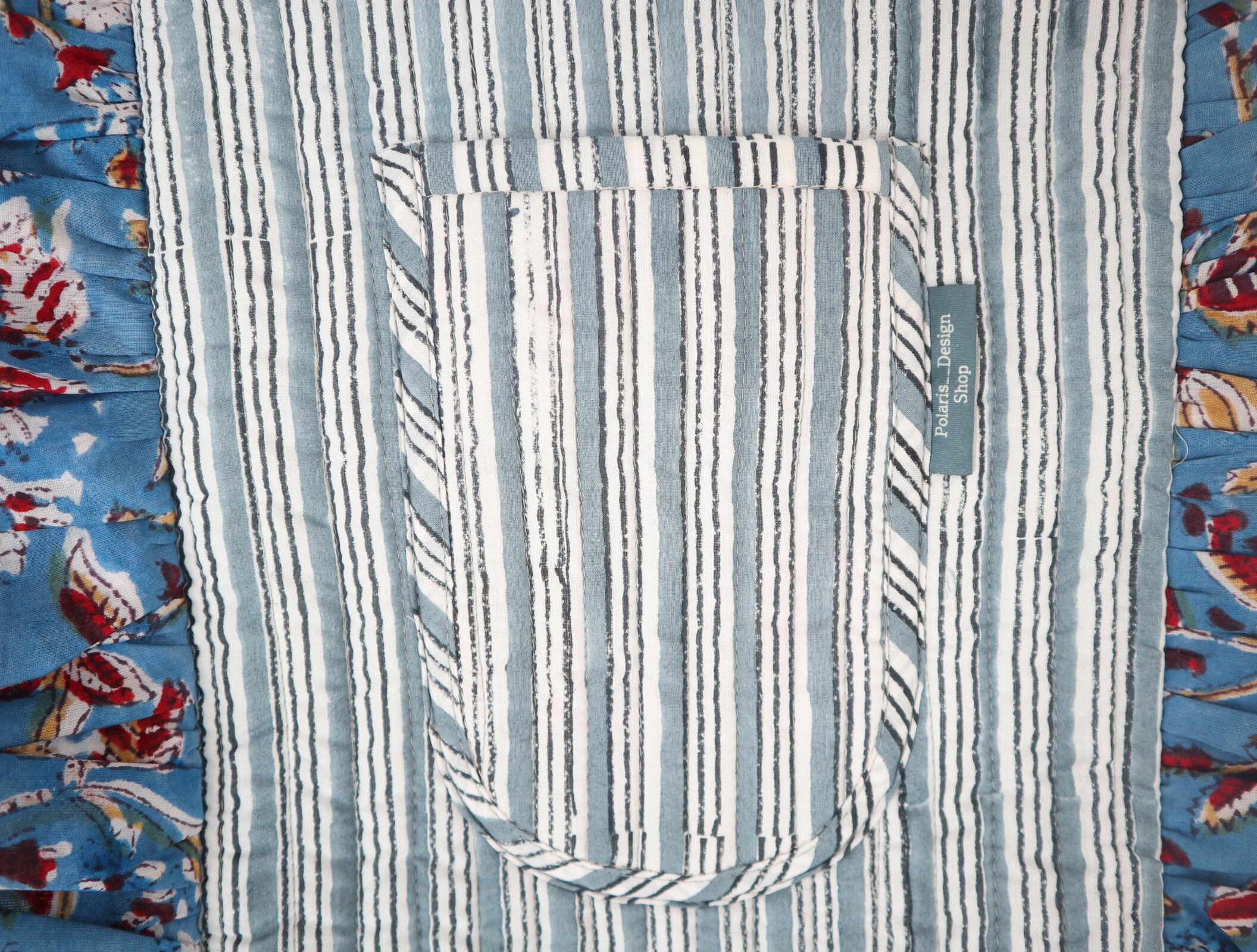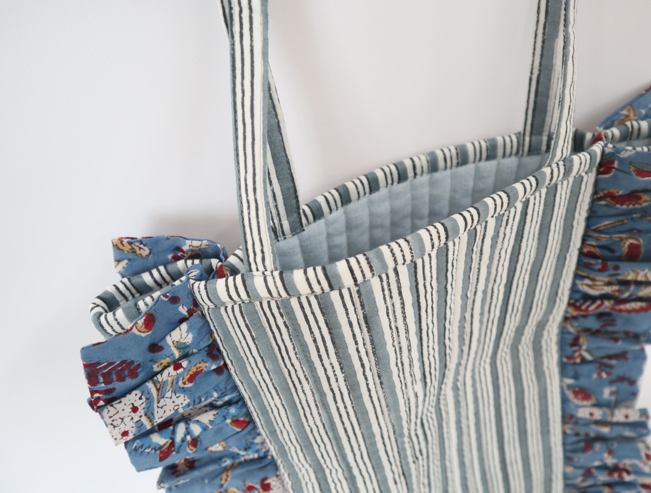 ハンドブロックプリントのフリル付きトートバッグ(ブルー)